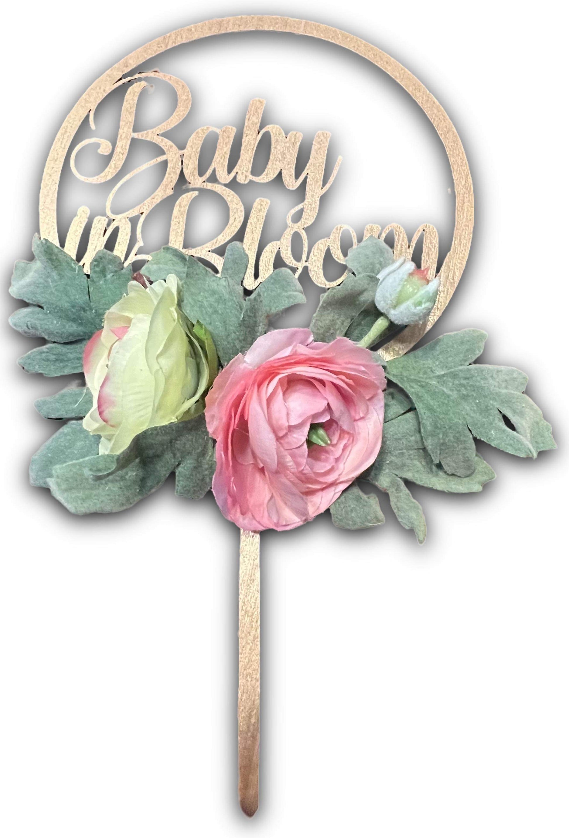 “Baby in Bloom” cake topper for Baby Shower. Theme available in multiple color options. 6 inches plus florals.