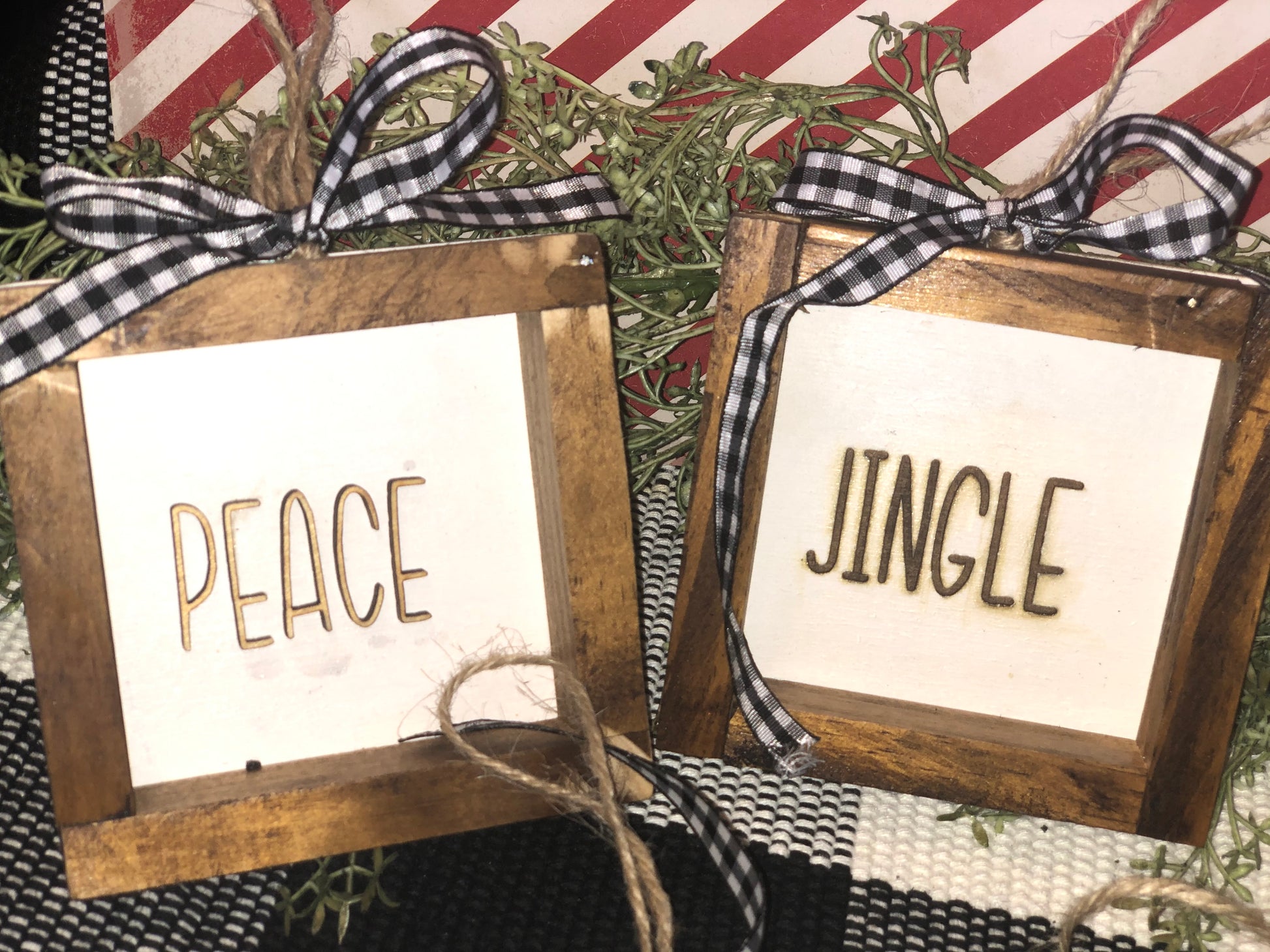 Add a primitive touch to your home year round or accent your tree this holiday season with these wooden handmade farmhouse frames. Measuring 4x4 inches and contains no cardboard Or MDF. Ribbon and frame color options available at checkout. Letting in black is raised wooden letters. Letting in brown is engraved into the picture. These are sold as singles and bundle options are available listed as “Farmhouse Frame Ornament Bundles” in shop listings. Please message me with any questions you may have have. Include word choice in memos/ notes to seller at checkout. Word choices: