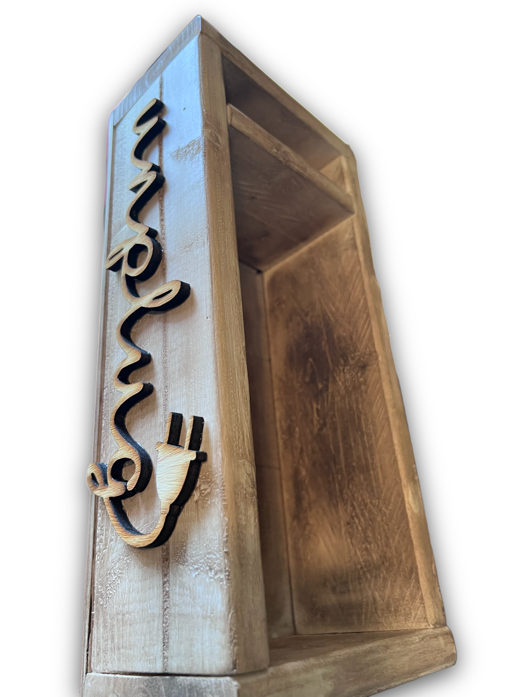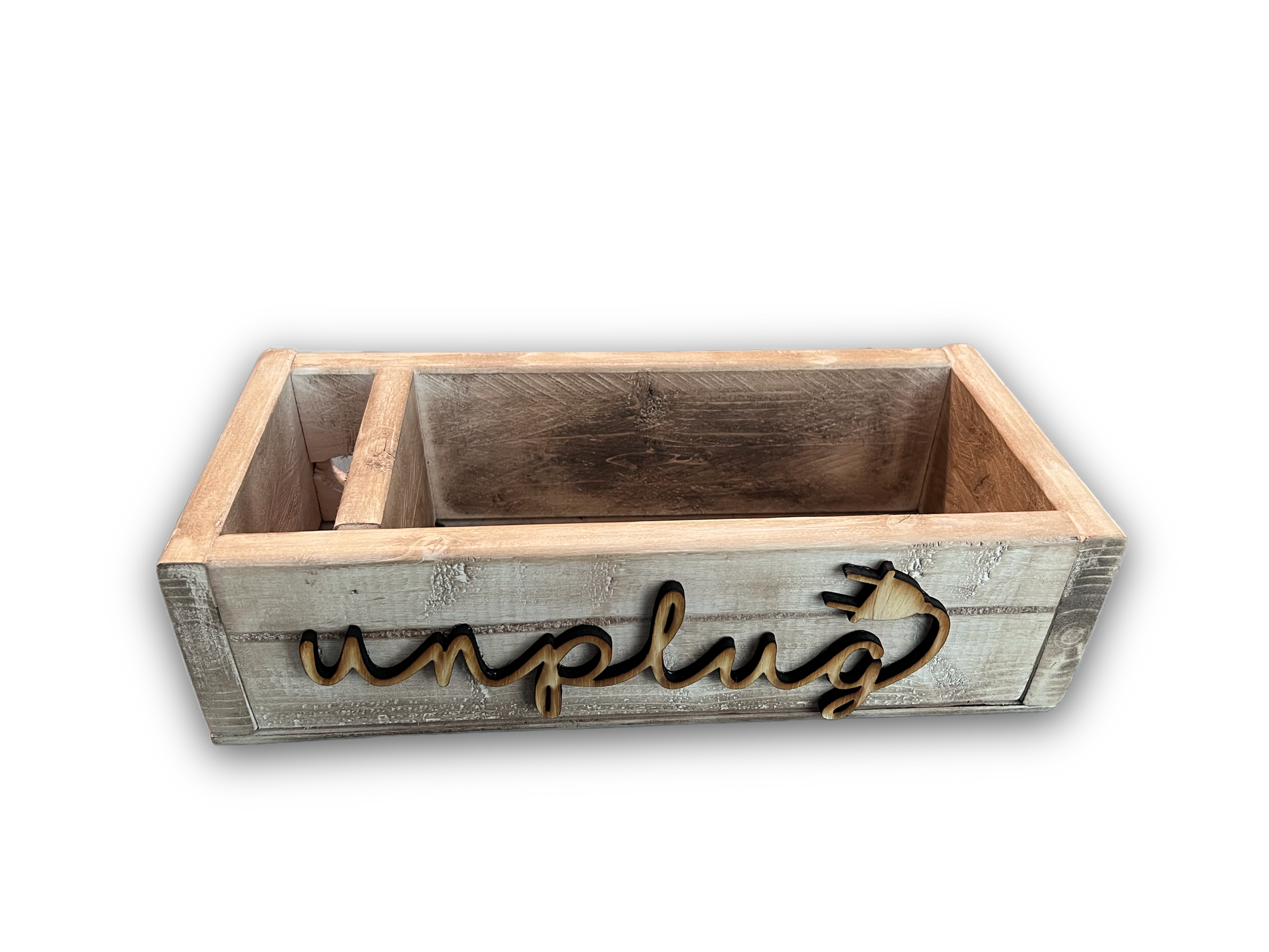 “Unplug” Device Caddy for mobile devices such as, cell phones, tablets, iPads, Nintendo switch, DS, etc. side partition allows for easy cord access so you can charge devices while “unplugging” from the digital world and reconnecting with family friends. Perfect for device restriction! Very sturdy and measures 13x6x4.